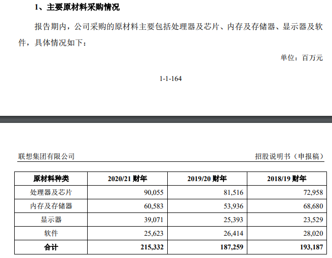 数据显示,2020/21财年,联想集团原材料采购金额达到了2153亿元。其中处理器和芯片,就达到了900.55亿元,内存及存储器达到605.83亿元。