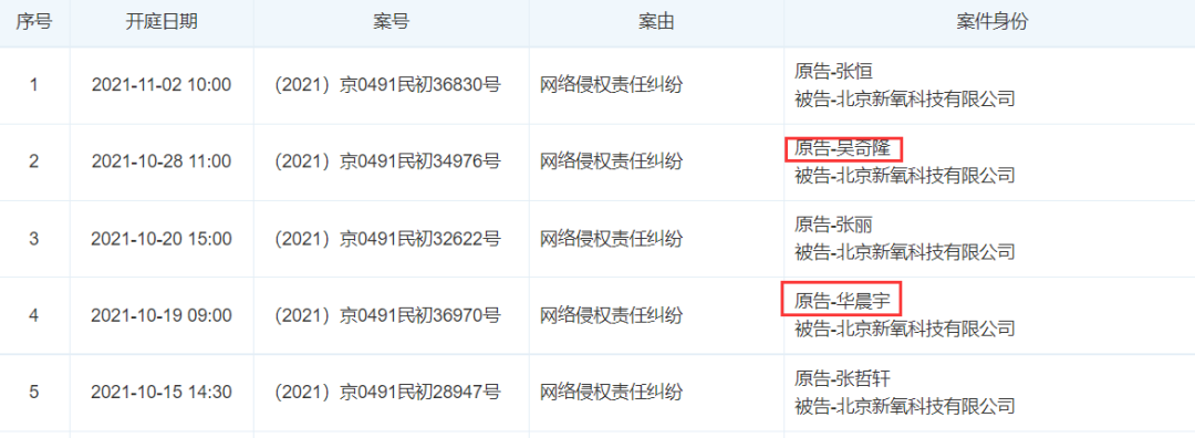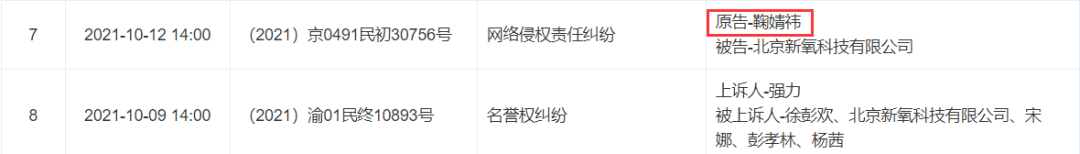据天眼查数据显示,自2021年10月9日起,新氧将面临包括吴奇隆、华晨宇、鞠婧祎等明星的起诉。而在刚刚过去的9月,已有杨蓉、蒋梦婕等明星曾起诉新氧。
