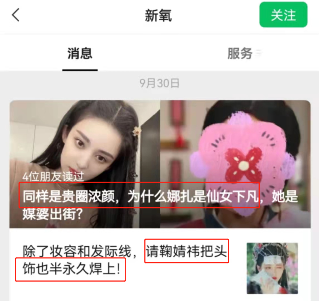 除此之外,在新氧的公众号文章中,更是在标题中疯狂蹭明星流量。在今年9月30日推送的文章中,一篇题目为《除了妆容和发际线,请鞠婧祎把头饰也半永久焊上!》的文章中,提到鞠婧祎就一段话,剩下的都在讲古装剧里的头饰造型。