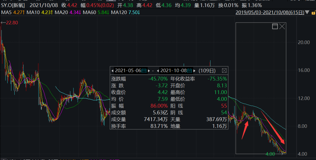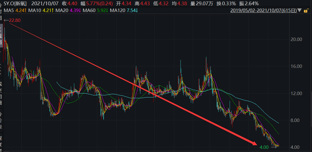 但是没有想到,对于新氧来说,上市即是巅峰。截至2021年10月7日,新氧收盘于4.4美元/股,较上市初期峰值22.80美元/股下挫超80%;较今年高位17.40美元/股,也已下挫75%