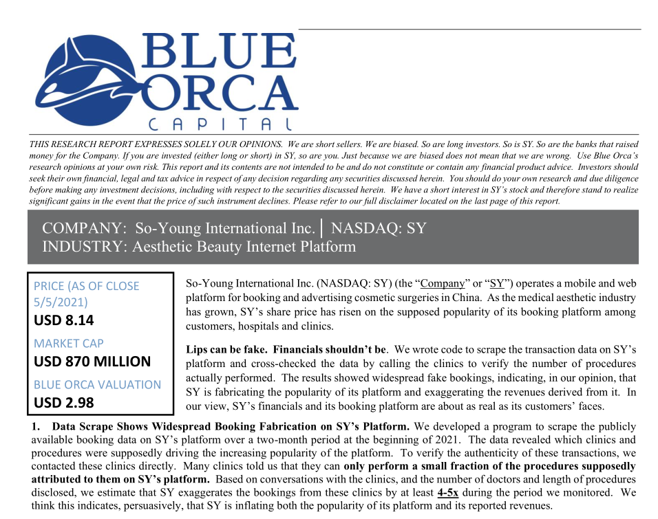美东时间5月6日,被外界称为“杀人鲸”的知名沽空机构Blue Orca Capital(以下简称蓝鲸资本)对外发布了新氧沽空报告。