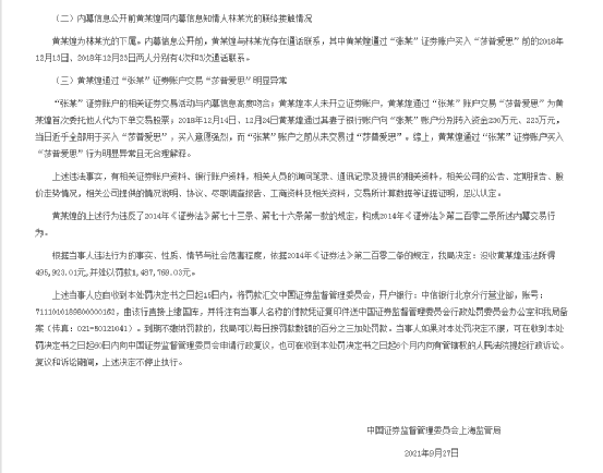由于黄某煌的相关行为违反了2014年《证券法》第七十三条、第七十六条第一款的规定,构成2014年《证券法》第二百零二条所述内幕交易行为。证监会上海监管局决定,没收黄某煌违法所得495,923.01元,并处以罚款1,487,769.03元。共罚没超198万元。