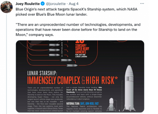 今年4月,NASA给予SpaceX、蓝色起源、Dynetics关于月球着陆器的开发资金,日前NASA一项关于月球着陆器招标中,SpaceX和Dynetics共同获得价值29.8亿美元的订单,蓝色起源落选,这也是亚马逊起诉NASA的导火索。