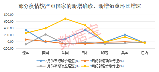 根据各个国家公布的数据,疫情较为严重的德国、英国、法国、美国、日本、印度、巴西等7个国家中,9月份新增确诊新冠肺炎的人数环比下降的有法国、日本、美国等,其中,法国、日本环比下降60%以上,美国环比下降3%左右;疫情最严重的印度,9月份新增确诊人数为3月份以来最低水平,环比下降近两成。