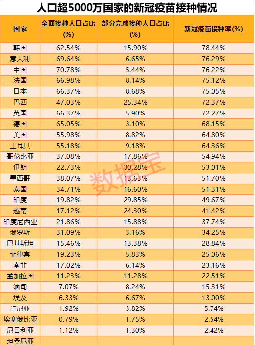 从人口超5000万的28个国家来看,4国接种率不到10%,集中在非洲,包括肯尼亚等。14个国家有超过一半人口接种,中国、法国、意大利、英国接种率超过70%,中国新冠疫苗接种率在人口超1亿国家中排名第一,接近75%,其中全面接种的人口占比超七成。