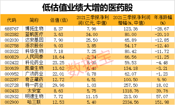截至当前,发布三季报(预告)共有80余家,估值低于30倍(大于0)且三季报(含中值)净利润同比增长30%以上的医药生物股有14只,蓝帆医疗、科华生物、明德生物等估值低于10倍;从业绩来看,哈三联、太安堂2021三季报净利润同比增幅中值超过1000%,其中哈三联净利润增幅中值超过2300%,主要受非经常性损益增加所致,公司是东北地区首家生产聚丙烯安瓿注射剂的企业。太安堂是国家级非遗、中华老字号中药企业。