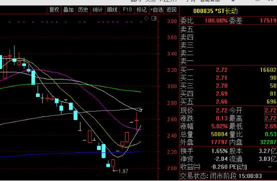 近期,*ST长动走势颇为诡异,公司股价逆势上涨。二级市场显示,在过去的5个交易日,4次涨停。截止10月16日,公司股价收盘于2.72元/股。