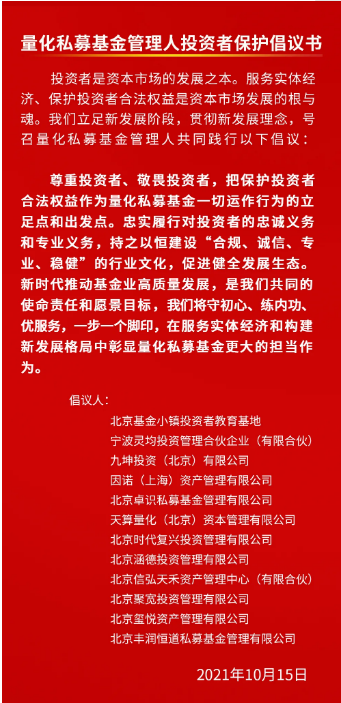 10月15日,在“服务量化 携手发展——量化私募基金管理人合规发展”座谈会上,北京基金小镇投资者教育基地联合11家量化私募基金机构共同发布《量化私募基金管理人投资者保护倡议书》。