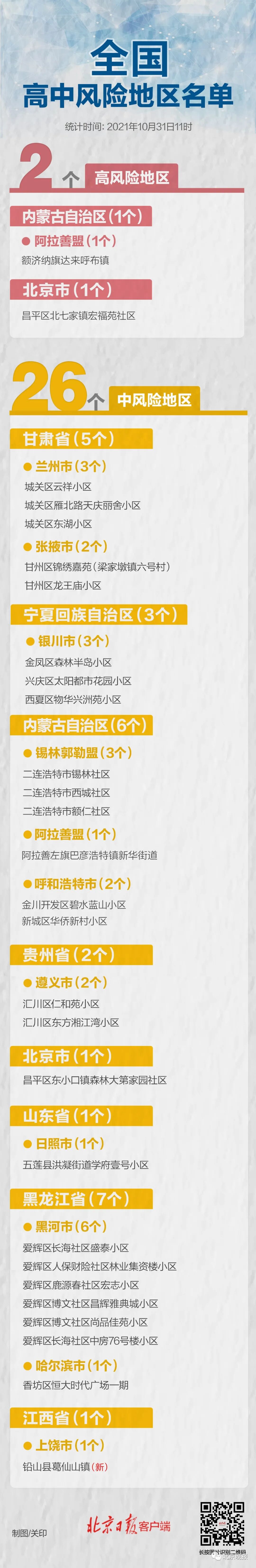 截至2021年10月31日11时,全国共有高中风险区2+26个。