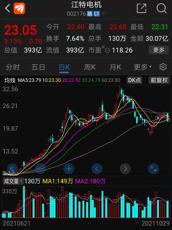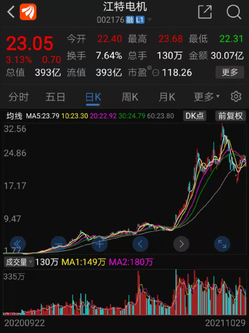 整个三季度江特电机几乎没有回调地一路上涨,期间收出过13个涨停,7月一个月涨了137%,8月再涨43%,9月再涨25%一度冲到32.6元,随后有所回调,整个三季度涨了204%,而从2020年5月的低点1.25元算起,涨幅达到25倍。