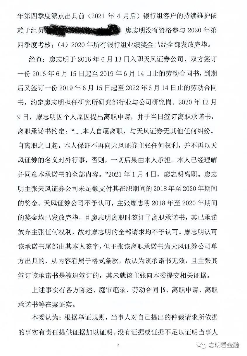 4、天风证券这边认为,第一、廖志明离职的时候就承诺不向公司主张任何权利;第二、2018、2019两年,因为有银行组的分析师没经考核就离职,本来属于他们的奖金也不能算到廖志明的身上;第三、廖志明没有参与2020第三季度的考核,而且四季度工作量明显锐减,客户派点是其他同事在做,因此也没资格参与2020四季度的考核。
