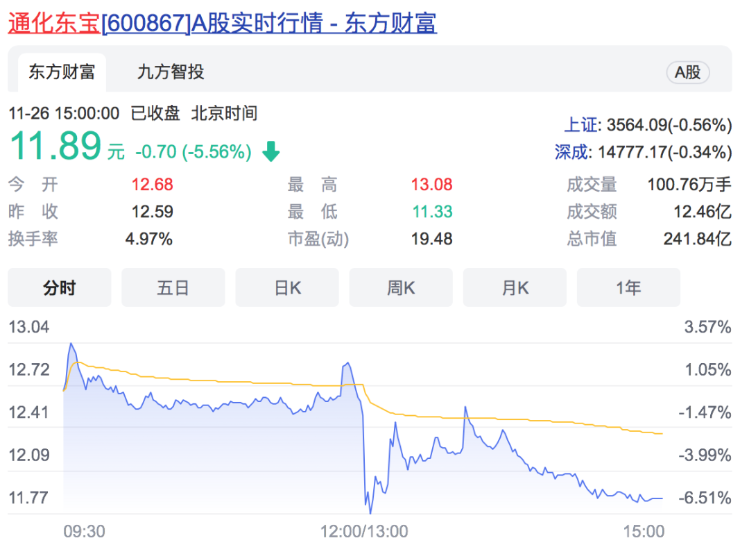 通化东宝是另一家胰岛素龙头企业,2020年重组人胰岛素注射液销售金额约22亿元。公司的二代胰岛素产品市场占有率较高,三代胰岛素中门冬胰岛素于今年10月份刚刚获批上市,搭上了集采的末班车。不过在中标结果公布后,其股价走势却与甘李药业相反,11月26日午后直线下跌,最后收跌5.56%。