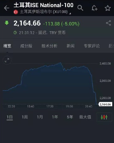 当地时间下午4:24,土耳其股市暴跌触发伊斯坦布尔证券交易所的熔断机制。