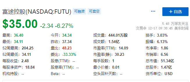 中概股美股也多数下跌,老虎证券跌超10%,富途证券跌超6%,拼多多、小鹏汽车跌超3%,B站、京东、理想汽车、蔚来、阿里巴巴、百度、网易也纷纷下跌。