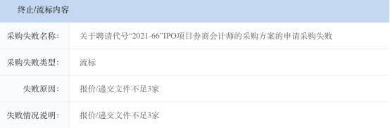 近日,深圳某采购平台显示,一家大型上市券商的IPO项目券商会计师采购方案申请采购失败,公开资料显示,报价/递交文件的不足3家。