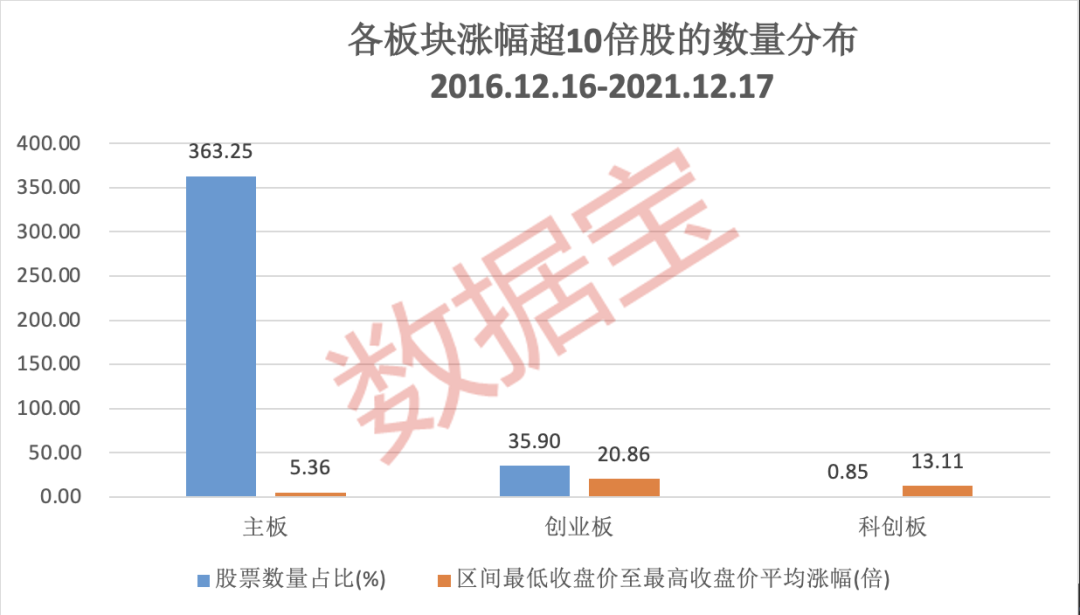证券时报·数据宝统计,近5年中(2016.12.16-2021.12.17),最低收盘价至最高收盘价涨幅超10倍的A股(不含北交所股票)共计117只,其中主板有74只,占比六成以上,区间内最低收盘价至最高收盘价平均涨幅15倍以上;创业板股票42只,占比36%,同期平均涨幅近21倍。