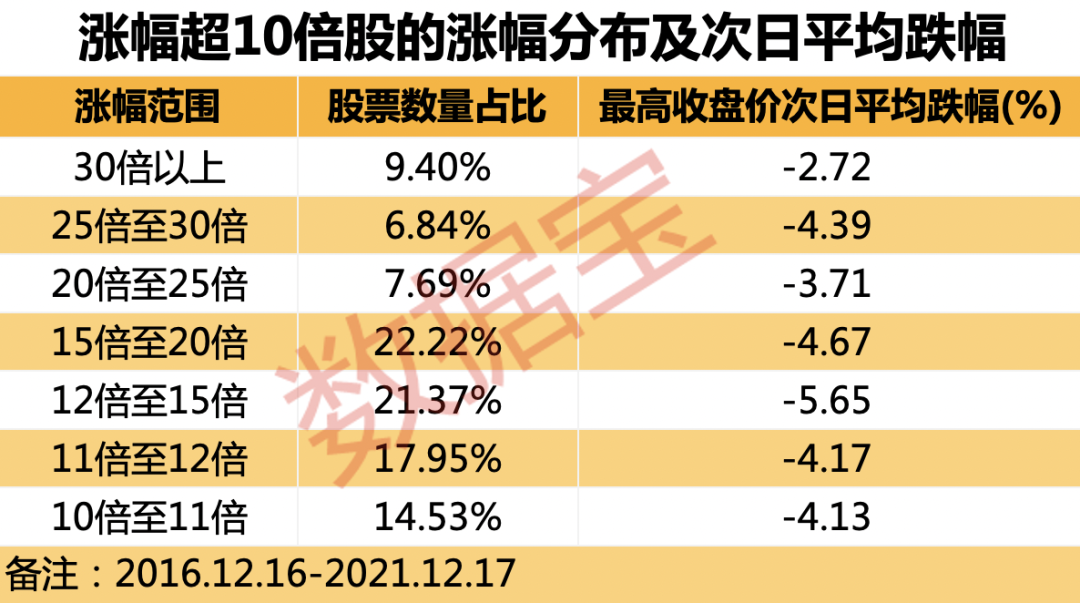 值得一提的是,上述股票在录得最高价后的次日,平均跌幅接近4.5%,甚至有个股直接跌停。涨幅相对较低股,最高收盘价的次日跌幅较高,其中涨幅在12倍至15倍个股,在最高收盘价的次日平均跌幅最大,高达5.58%。这提醒投资者,在获得较高的回报后,及时止盈非常重要。