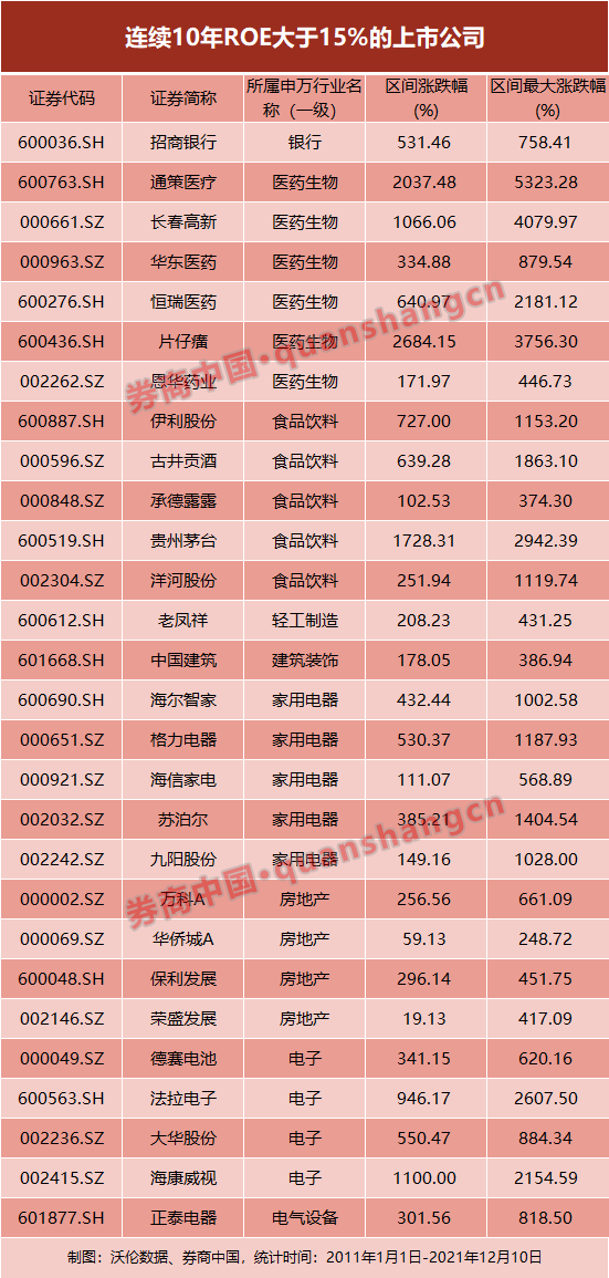券商中国的统计数据显示,A股共有约30家上市公司的净资产收益率在长达10年的时间中连续高于15%,它们分布在医药生物、食品饮料、家用电器、电子、银行、轻工制造等行业中。