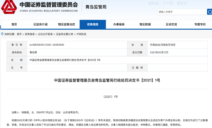 今年5月份,证监会青岛监管局发布的【2021】1号行政处罚决定书显示,根据相关规定,决定对杨某君涉嫌违法买卖股票以及违法为客户办理证券认购、交易行为进行了立案调查。
