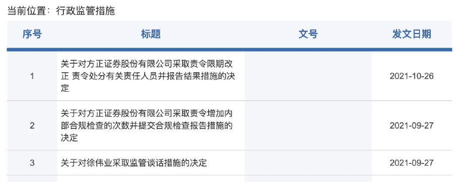 除此之外,方正证券因未能严格规范工作人员执业行为,未能及时发现并采取有效措施予以纠正等问题,湖南证监局对其采取责令增加内部合规检查的次数并提交合规检查报告措施的决定。