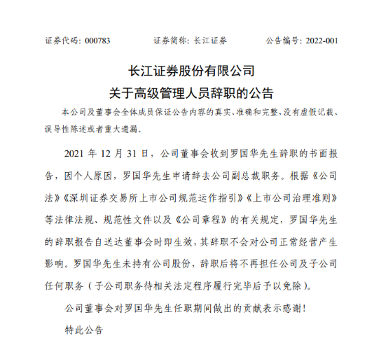 2021年最后一天,长江证券副总裁罗国华官宣辞职。