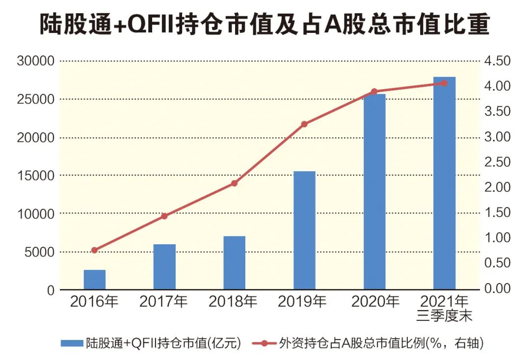 数据宝统计,截至2021年三季末,以QFII和陆股通渠道进入A股市场的境外投资者合计持有境内股票资产总市值接近3万亿元,较2020年末增长14.19%。外资持仓市值占A股总市值的比重为4.06%,超过险资和私募基金,较2020年末增长了0.35个百分点。