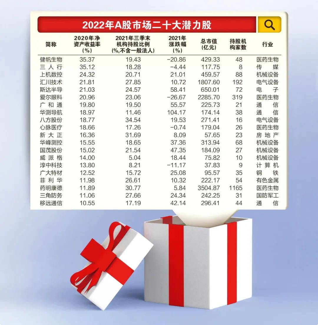 经过综合排序,2022年二十大潜力股出炉,分布于11个行业,市值多在500亿元以下,机械设备、通信、电气设备行业入选股扎堆。市场表现方面,二十大潜力股2021年平均涨幅在20%以上,跑赢同期上证指数15个百分点以上。个股方面,有六成2021年涨幅超过10%,华测导航、斯达半导相对领先,2只个股2021年涨幅均超过55%。