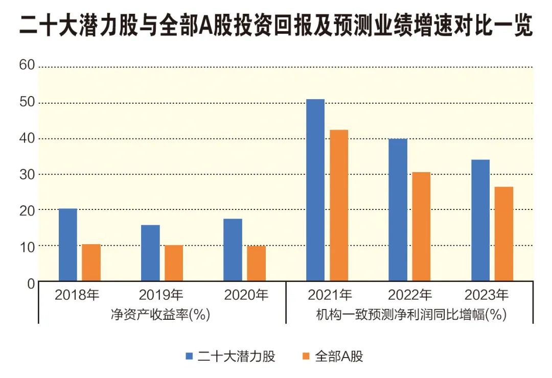 潜力股未来业绩有望增长。机构一致预测2021年至2023年,二十大潜力股净利润增幅中位数均超过30%,超过全部A股近10个百分点,其中2021年净利润增幅中位数超过50%,华峰测控、三角防务等个股净利润或翻倍。