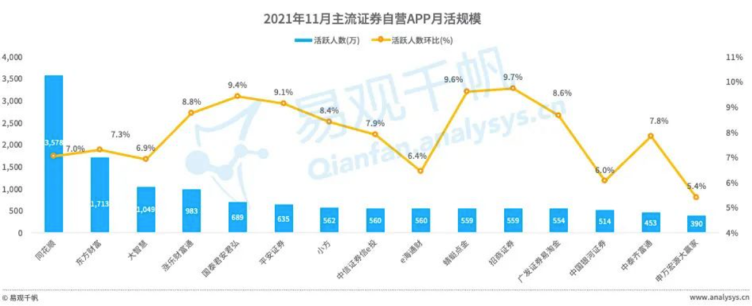 易观千帆数据显示,2021年11月证券各应用活跃用户增速较快,同花顺和东方财富月度活跃人数相较于券商自营APP优势显著。在自营APP中,涨乐财富通月活逼近1000万。国泰君安君弘和平安证券紧随其后,小方、中信证券信e投、海通证券的e海通财等月活突破500万APP的活跃量竞争日趋激烈。