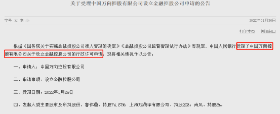 1月30日央行官网公告,已受理深圳市招融投资控股有限公司和中国万向控股有限公司设立金融控股公司的申请,受理时间分别是2021年12月31日和2022年1月29日。其中招融投资控股背后为央企招商局集团,而万向控股实控人为中国知名民营企业家鲁冠球之子鲁伟鼎。