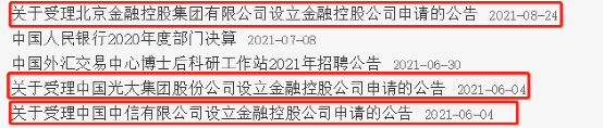 但是,金控牌照的申设并不容易,此次两家公司获受理之前,央行仅受理了三家企业关于设立金融控股公司的行政许可申请,分别是中信集团、光大集团和北京金融控股集团,其中中信集团和光大集团为央企,于去年6月获受理;北京金控是地方金控平台,于去年8月获受理。