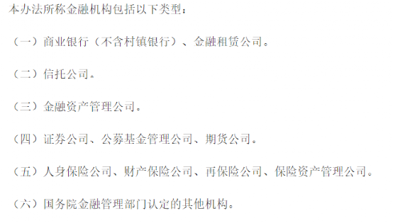 根据央行《金控办法》,其认定的金融机构有六类,商业银行和金融租赁公司是一类;信托公司单独一类;券商、期货公司和基金公司是一类;保险公司和保险资产管理公司是一类;金融资产管理公司(AMC)是一类;还有一个兜底的“其他机构”。