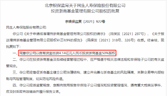 实际上,民生人寿目前还持有浙商基金50%的股份,而另外50%的股份民生人寿拟以自有资金出资4.14亿元收购,并于去年11月获得监管批复,交易完成后浙商基金将成民生人寿全资子公司,也将完成实质控制。