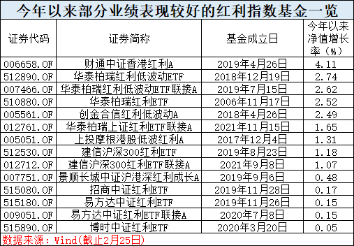 Wind数据显示,截止2月27日,包括财通中证香港红利、华泰柏瑞红利低波动ETF、创金合信红利低波动在内5只红利指数基金年内涨幅超过2%,多达15只红利指数基金开年以来维持正收益,全市场红利指数基金年内平均下跌0.81%,抗跌能力凸显。