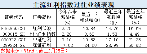 Wind数据统计,截止2月27日,包括财通中证香港红利、华泰柏瑞红利低波动ETF、创金合信红利低波动在内5只红利指数基金年内涨幅超过2%,多达15只红利指数基金开年以来维持正收益,全市场红利指数基金年内平均下跌不到1%,大幅跑赢主动权益基金平均业绩6个百分点。