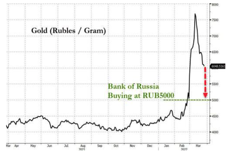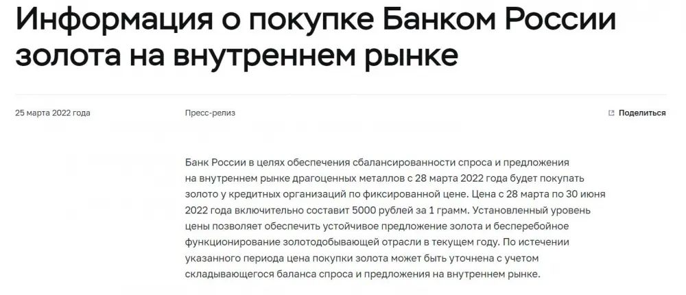 当地时间3月25日,俄罗斯央行宣布,将从2022年3月28日起以固定价格从信贷机构购买黄金,2022年3月28日至6月30日期间的购买价格为每克5000卢布(以当前汇率折算约合52美元)。