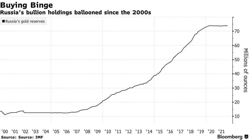 资料显示,自2000年代中期以来,俄罗斯将其黄金储备扩大了近6倍,打造了全球第五大黄金储备。截至2月1日,俄罗斯持有的7390万盎司的黄金储备价值约为1320亿美元。