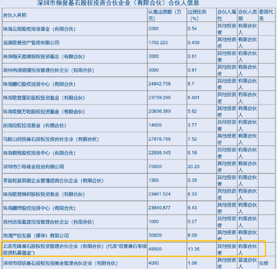 深圳市市场监督管理局网站信息显示,深圳市领誉基石股权投资合伙企业(有限合伙)的股东名单中,写着:北京先锋基石股权投资管理合伙企业(有限合伙)(代表“领誉基石专项投资私募基金”)。