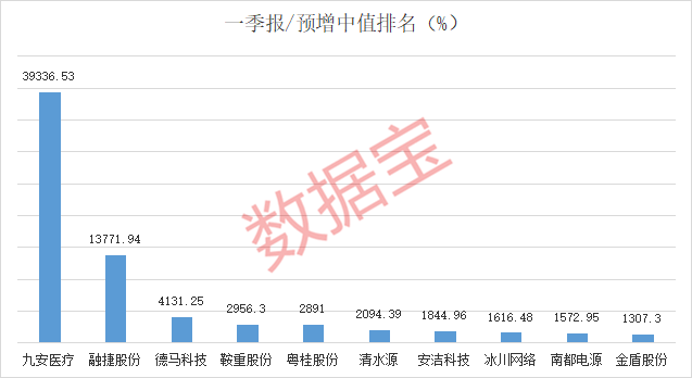 具体到个股看,九安医疗预计净利润增幅最高。公司预计一季度净利润增幅中值为39336.53%,预增上限接近420倍;融捷股份、德马科技预计净利润同比增幅中值分别为13771.94%、4131.25%,增幅位列第二、第三。