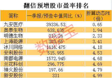 按照最新价以及一季报、预告净利中值计算,业绩预计翻倍股中还有一批估值较低的个股。其中,九安医疗折算市盈率0.65倍榜单最低。此外,奥泰生物、明德生物等个股市盈率均低于3倍。