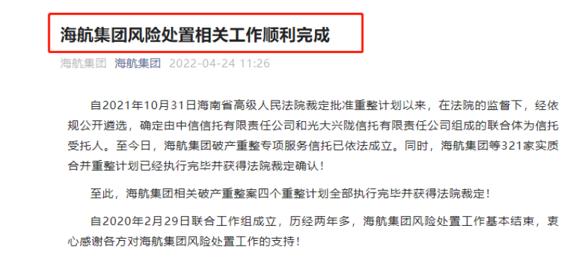 直到2022年4月24日,海航集团宣布,海航相关破产重整案四个重整计划全部执行完毕并获得法院裁定,海航集团风险处置工作基本结束。