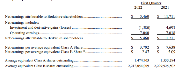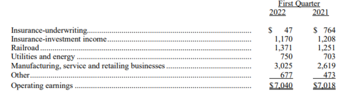 会议开始前,伯克希尔哈撒韦发布了2022年第一季度财务报告。公司第一季度营收708.1亿美元,同比增长9.6%,上年同期645.99亿美元;归属于母公司股东的净利润达54.6亿美元,同比下滑53%,上年同期为117.11亿美元。其中,公司运营利润达70.4亿美元,上年同期70.18亿美元;投资和衍生品亏损15.8亿美元,上年同期收益为46.93亿美元。保险浮存金接近1480亿美元,较2021年底增加近10亿美元。
