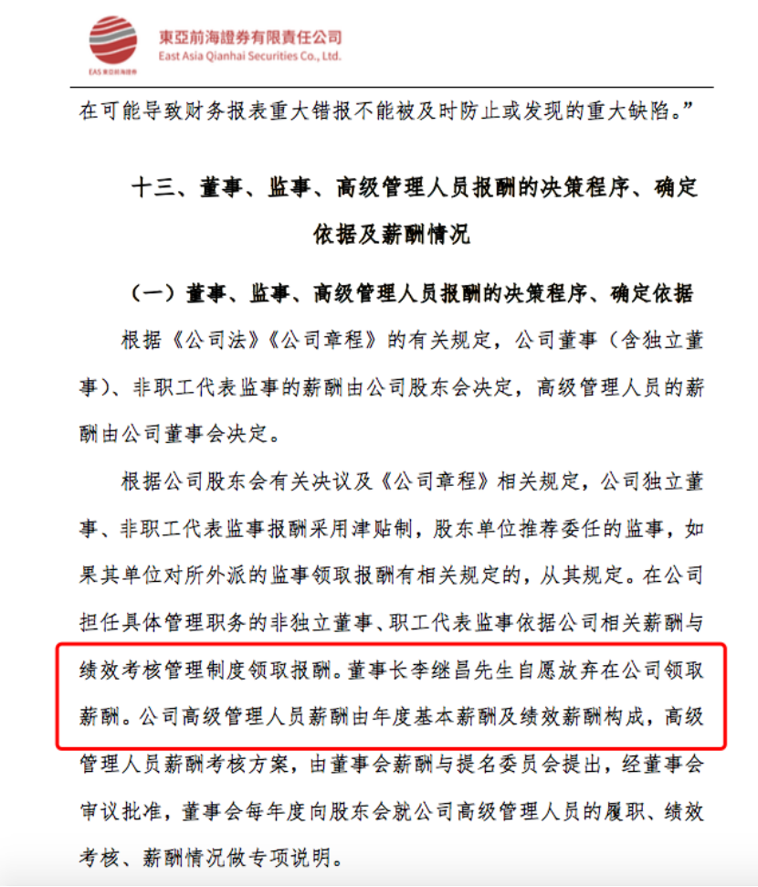 值得一提的是,自2018年以来连续4年东亚前海证券董事长李继昌放弃在公司领取薪酬。