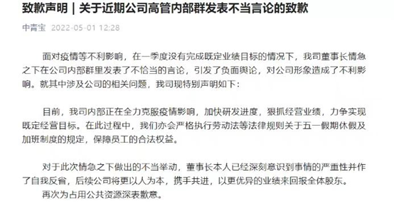 在当时的声明中,中青宝表示,面对疫情等不利影响,在一季度没有完成既定业绩目标的情况下,公司董事长情急之下在公司内部群里发表了不恰当的言论,引发了负面舆论,对公司形象造成了不利影响。