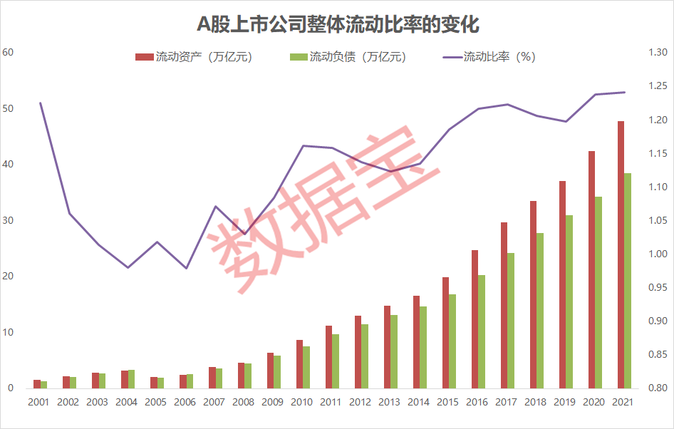 数据宝统计,剔除金融类上市公司,2021年A股上市公司整体流动比率攀至2001年来新高,最新值为1.24,说明上市公司偿付短期债务的能力正逐年向好。