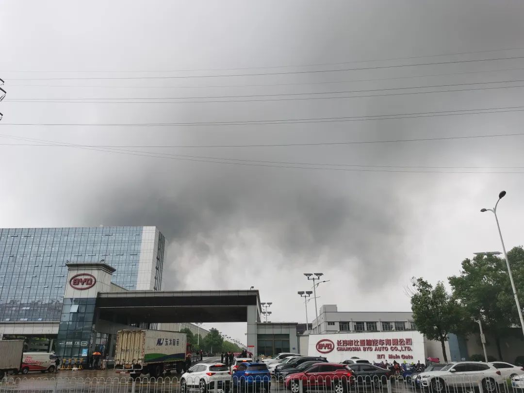 10分钟后,火势越来越大,刺鼻的浓烟漫过街道,向比亚迪厂区飘去。或许是仓库中有助燃的物资,火舌上撩,掺杂噼里啪啦的炸裂声,浓烟滚滚,覆盖了长沙比亚迪大部分厂区。