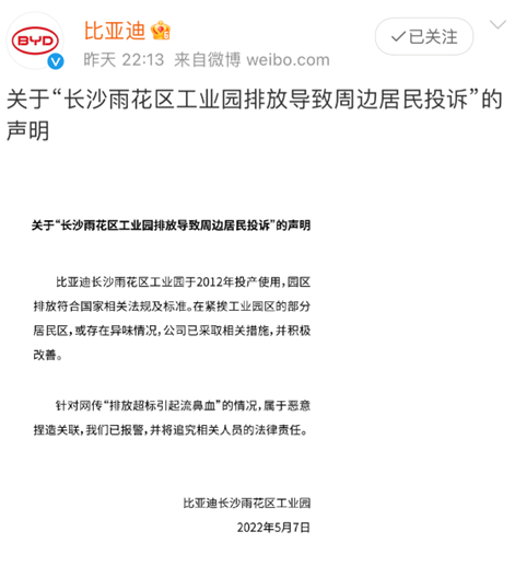 在他看来,长沙比亚迪工厂在产量攀升、工厂扩建的过程中,所产生的污染和废气排放也会有所加剧,公司应该主动适应新增产能所带来的污染防止压力,及时通过新技术有效降低污染物排放,以减轻对周边环境构成的影响。