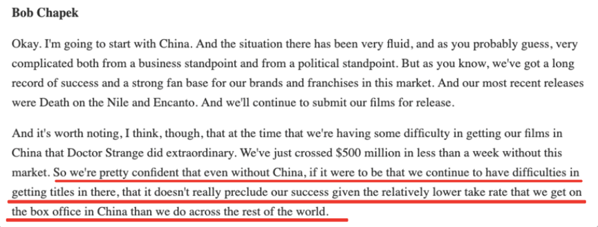 鲍勃·查佩克称,正在上映的电影《奇异博士2:疯狂的多元宇宙》在没有中国市场的情况下,在一周内全球票房就突破了5亿美元。所以公司非常有信心,即使没有中国市场,公司也能获得成功。