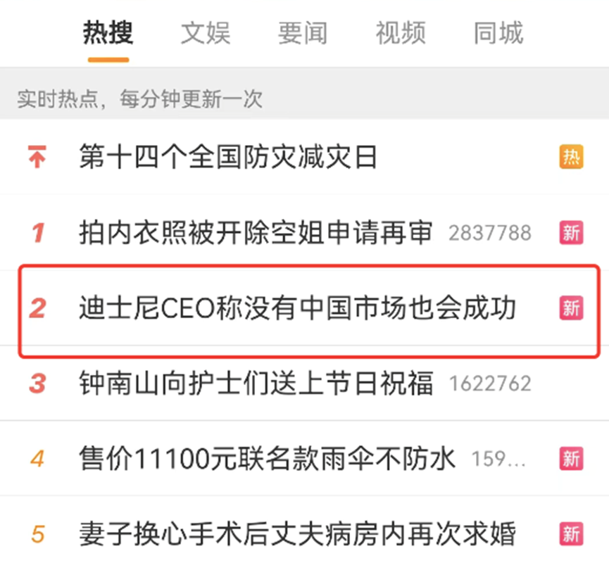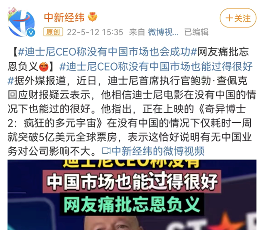 鲍勃·查佩克的这番言论引发网友不满。5月12日,该消息登上微博热搜。有网友表示,迪士尼有“吃饭砸锅”的嫌疑。