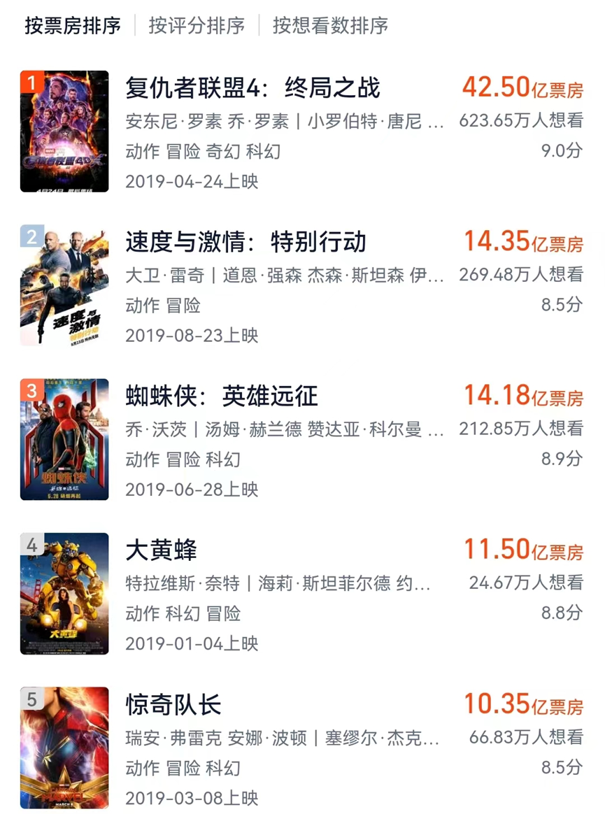 2018年《复仇者联盟3:无限战争》在国内获得23.89亿元票房,《海王》票房也超过20亿元,还有多部影票国内票房超过15亿元。2019年,《复仇者联盟4:终局之战》票房超过40亿元。